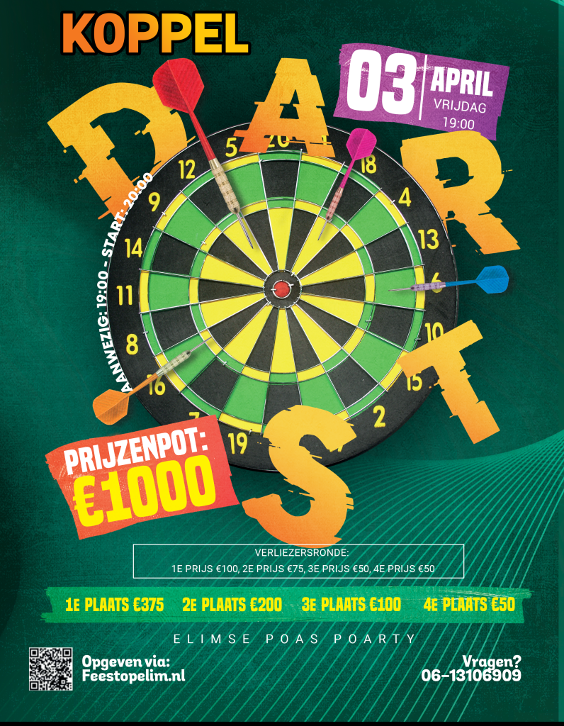 Ben je klaar om je dartvaardigheden te laten zien en samen met je maat de strijd aan te gaan? Dan is het Elimse Poas Koppeldarttournooi dé kans om je te bewijzen! Dit spannende evenement brengt dartliefhebbers van alle niveaus samen voor een onvergetelijke avond vol competitie, camaraderie en plezier.